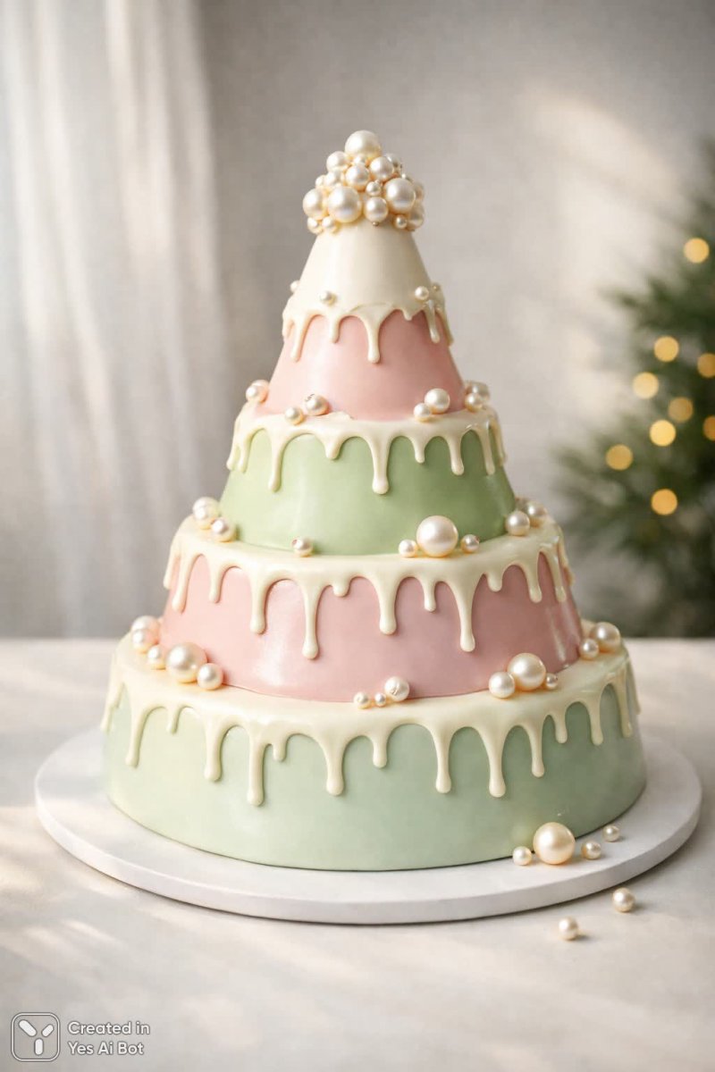 2. high-end food photograph of a dynamic christmas tree cake featuring stacked, conical layers covered in smooth fondant, detailed with delicate ganache drips, and topped with elegant edible pearls, all resting on a clean, minimal table. soft natural light emphasizes craftsmanship and festive creativity.