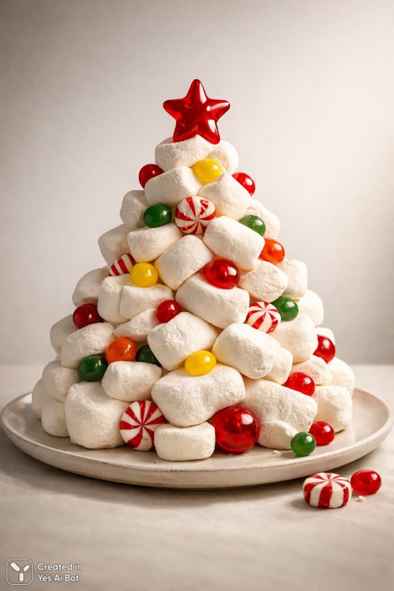 3. photorealistic image of a playful christmas tree crafted from fluffy marshmallows and colorful hard candies, arranged in irregular layers that create a lively silhouette, elegantly displayed on a ceramic plate with gentle lighting highlighting textures. bg is minimal, enhancing a cozy, joyful atmosphere.