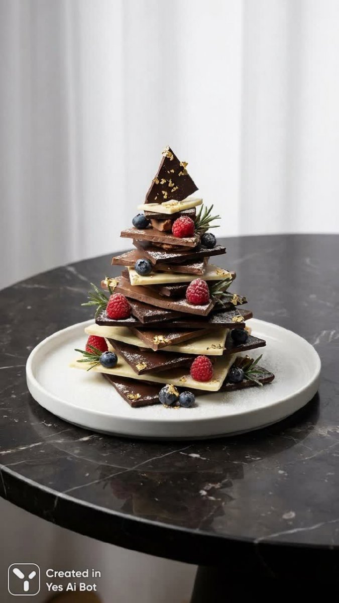 Изысканное фото рождественской елки из шоколада – настоящий шедевр кондитерского искусства. Слои темного молочного и белого шоколада гармонично переплетаются создавая неповторимый визуальный эффект. Яркие свежие ягоды добавляют праздничной композиции сочные акценты цвета оживляя общую картину. Асимметричная динамичная форма елки, выложенной на чистой тарелке, притягивает взгляд своей оригинальностью и изяществом. Мягкий рассеянный свет подчеркивает аппетитные текстуры шоколада и ягод делая фотографию невероятно реалистичной и манящей. Это не просто десерт это произведение искусства которое радует глаз и вызывает желание немедленно попробовать его. Рождественская елка из шоколада станет идеальным украшением праздничного стола или прекрасным подарком для любителей сладкого. Каждая деталь в этой фотографии продумана до мелочей от выбора ингредиентов до композиции и освещения создавая атмосферу волшебства и предвкушения зимнего праздника. Фотография демонстрирует мастерство кондитера и его любовь к своему делу. Это воплощение вкуса красоты и праздничного настроения
