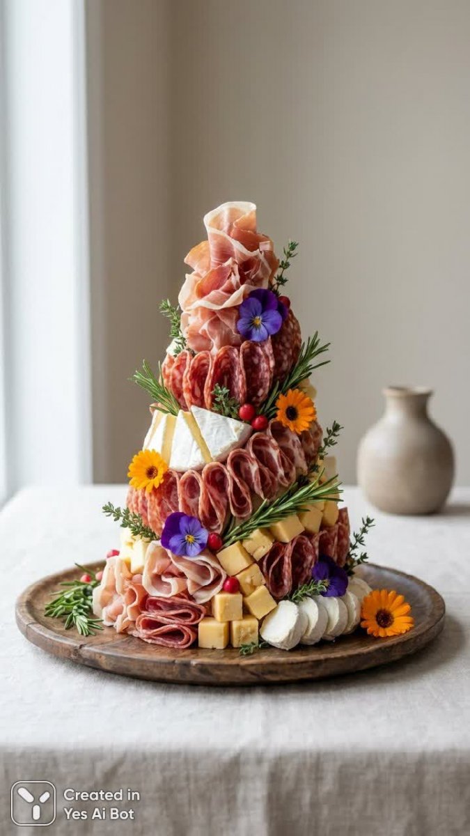 Роскошное праздничное блюдо – рождественская елка, мастерски созданная из разнообразных вяленых мясных деликатесов и авторских сыров. Искусное спиральное оформление поражает воображение своим великолепием и оригинальностью. Насыщенные цвета и богатые текстуры контрастируют друг с другом, создавая визуальный пир. Елка украшена свежими травами и съедобными цветами, которые добавляют яркости и живописности этому кулинарному шедевру. Основой композиции служит лаконичная деревянная доска, на которой елка покоится в мягком естественном свете, подчеркивающем аппетитный вид мясных и сырных ингредиентов и возвышающем мастерство повара. Минималистичный фон позволяет праздничному центру внимания оставаться главным объектом восхищения. Это не просто блюдо – это настоящее произведение искусства, сочетающее в себе гастрономическое удовольствие и эстетическую привлекательность. Идеально подходит для создания атмосферы тепла и уюта на новогоднем столе или для фотосессии, демонстрирующей креативный подход к кулинарии. Яркое сочетание вкусов и визуальное великолепие делают эту рождественскую елку незабываемым украшением любого праздничного мероприятия