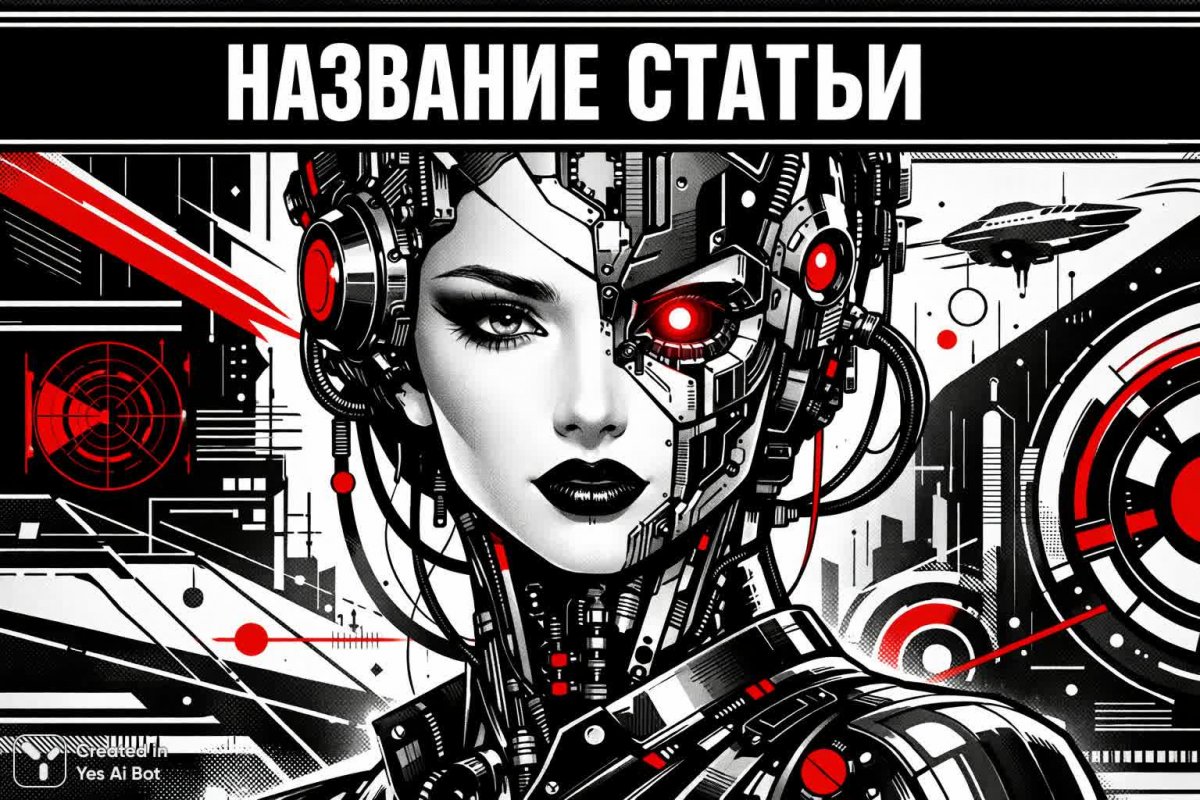 bold black banner with "Название статьи" against a monochrome bg, cyborg face in a futuristic setting, intricate line work, graphic design elements, minimal colors with striking red highlights, pop art influence, conceptual style, engaging visuals.