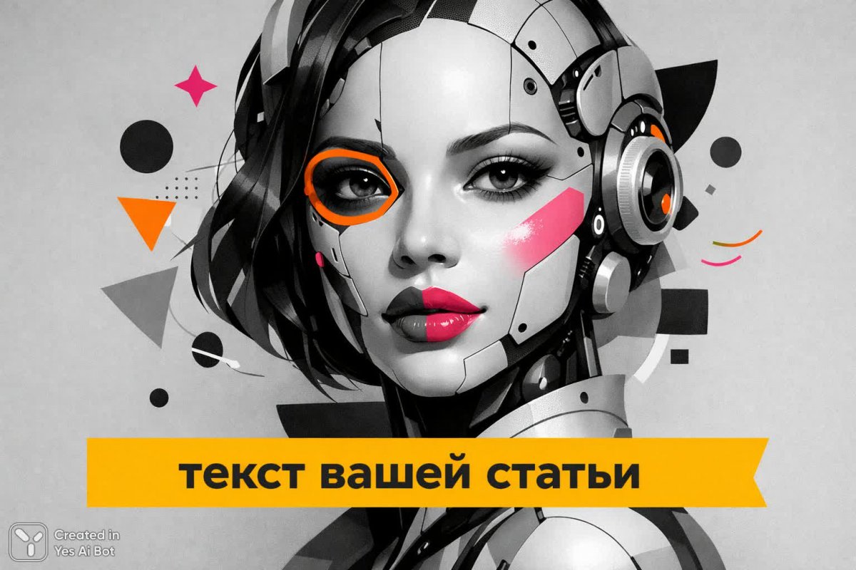 bw composition of a lovable cyborg face, modern art style, abstract geometric shapes, prominent features emphasized with orange and pink highlights, minimalist gray background, playful graphic accents, banner in yellow with "текст вашей статьи" in minimalistic style.
