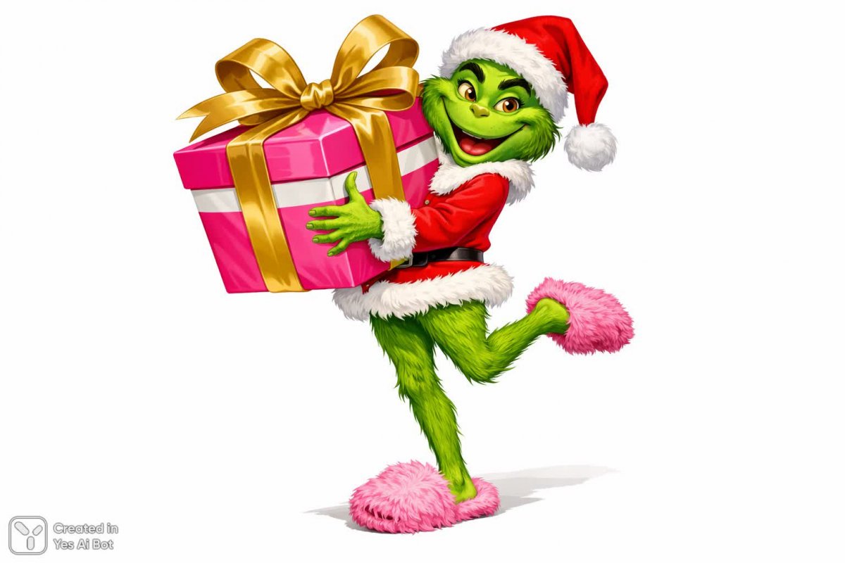 4. cartoon Grinch, happy face, wearing a Santa hat and pink fluffy slippers, holding a giant gift, funny pose, white background, playful illustration style, bright colors.