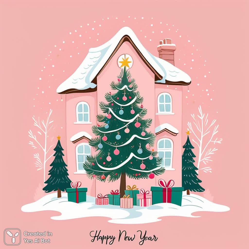Уютная новогодняя сцена, выполненная в нежной пастельной гамме розового цвета, переносит нас в сказочный мир иллюстраций Биттрикс Поттер. В центре композиции – пушистая ёлка, украшенная скромными подарками, словно сошедшими со страниц любимой детской книжки. Каждая деталь проработана с любовью и вниманием к деталям, создавая ощущение тепла и волшебства. Простой, чуть наивный рисунок напоминает зарисовку из дневника художника, а минималистичный стиль лишь подчеркивает очарование этой зимней истории. Иллюстрация излучает спокойствие и радость, передавая атмосферу семейного праздника и предвкушение чуда. Элементы фольклорного искусства добавляют картине особый шарм и неповторимость. Верхушку изображения венчает изящная каллиграфическая надпись С Новым Годом, выполненная плавными, завитками, словно приглашающая окунуться в мир сказки и новогоднего волшебства. Это идеальное украшение для открытки или подарка, способное подарить тепло и радость близким людям. Нежная цветовая палитра и милый сюжет делают эту иллюстрацию универсальной и подходящей для любого возраста. Она станет прекрасным напоминанием о чудесах зимних праздников и согреет душу в холодные дни