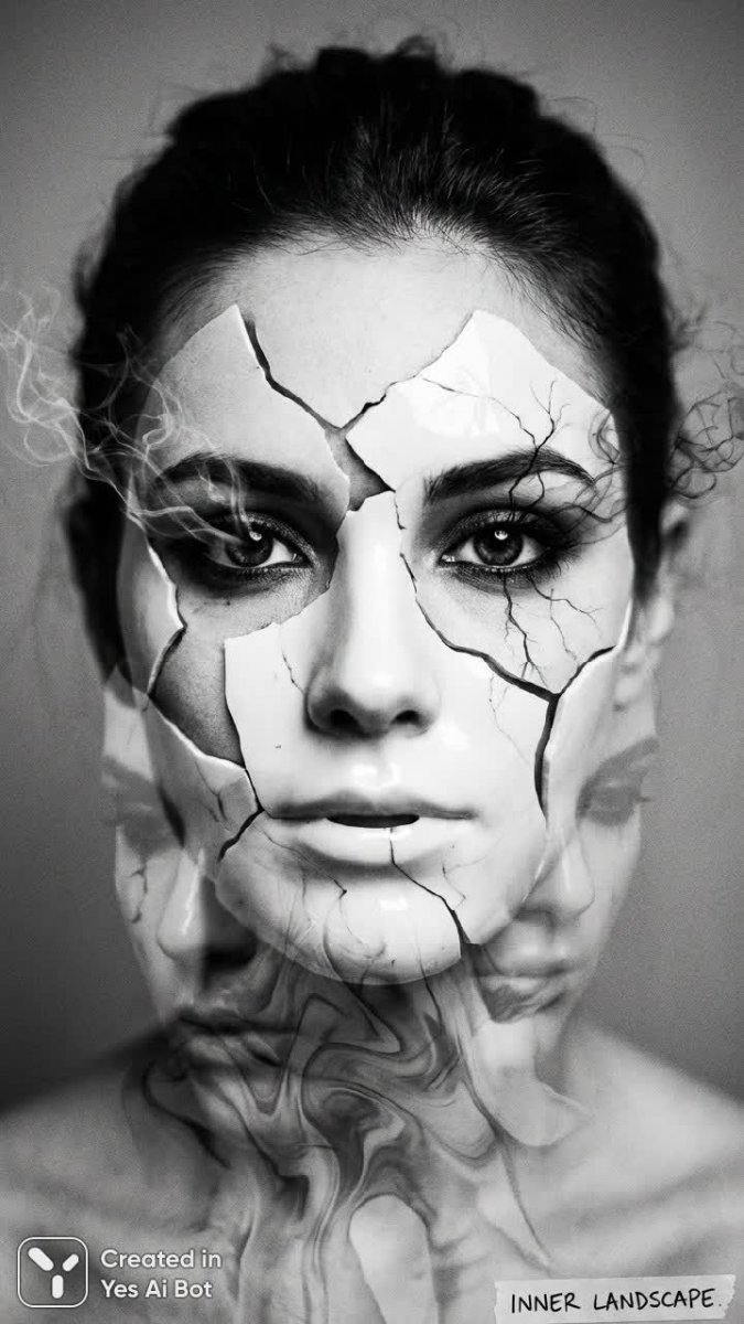 Завораживающий сюрреалистический портрет женщины, где хрупкая маска разбита на осколки, обнажая глубину её внутренних переживаний и эмоций. Взгляд, полный экспрессии и скрытого смысла, приковывает внимание зрителя, заставляя задуматься о непростых аспектах человеческой психики. Минималистичный фон позволяет полностью сосредоточиться на лице модели и сложной игре света и тени, подчеркивающей её психологическую уязвимость. Искусная манипуляция с изображением создает ощущение потусторонней красоты и загадочности, возводя портрет в ранг произведения тонкого искусства. Это не просто изображение, а глубокое исследование человеческой души, раскрывающее скрытые слои чувств и переживаний через призму художественной фантазии и мастерства исполнения. Композиция пронизана символизмом и метафорами, приглашая к созерцанию и размышлению о природе идентичности и хрупкости человеческого существования. Каждая деталь, от трещин на маске до выражения глаз, несет в себе определенный смысл, создавая многослойное и запоминающееся визуальное впечатление. Работа демонстрирует высокую степень владения техникой и художественным видением, воплощая собой идею о том, что истинная красота заключается в принятии собственной уязвимости и откровенности