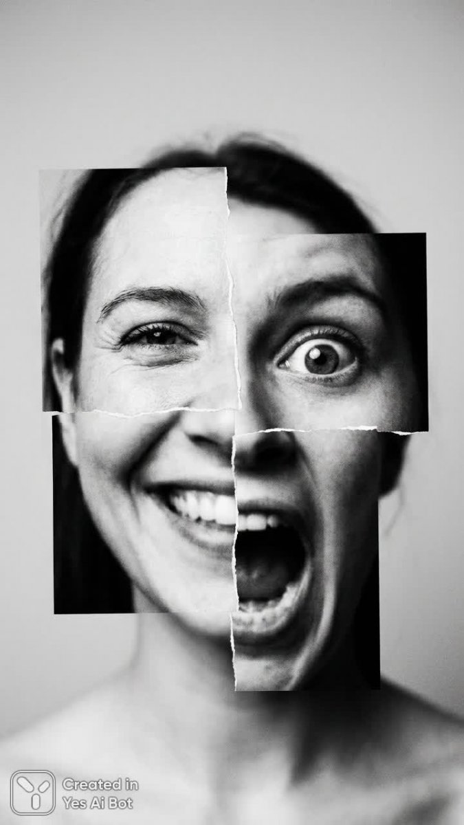 surreal merge, fragmented female face, emotions of joy and chaos, close-ups of eyes and lips, artistic photography, minimalist background, psychological concept, high contrast.