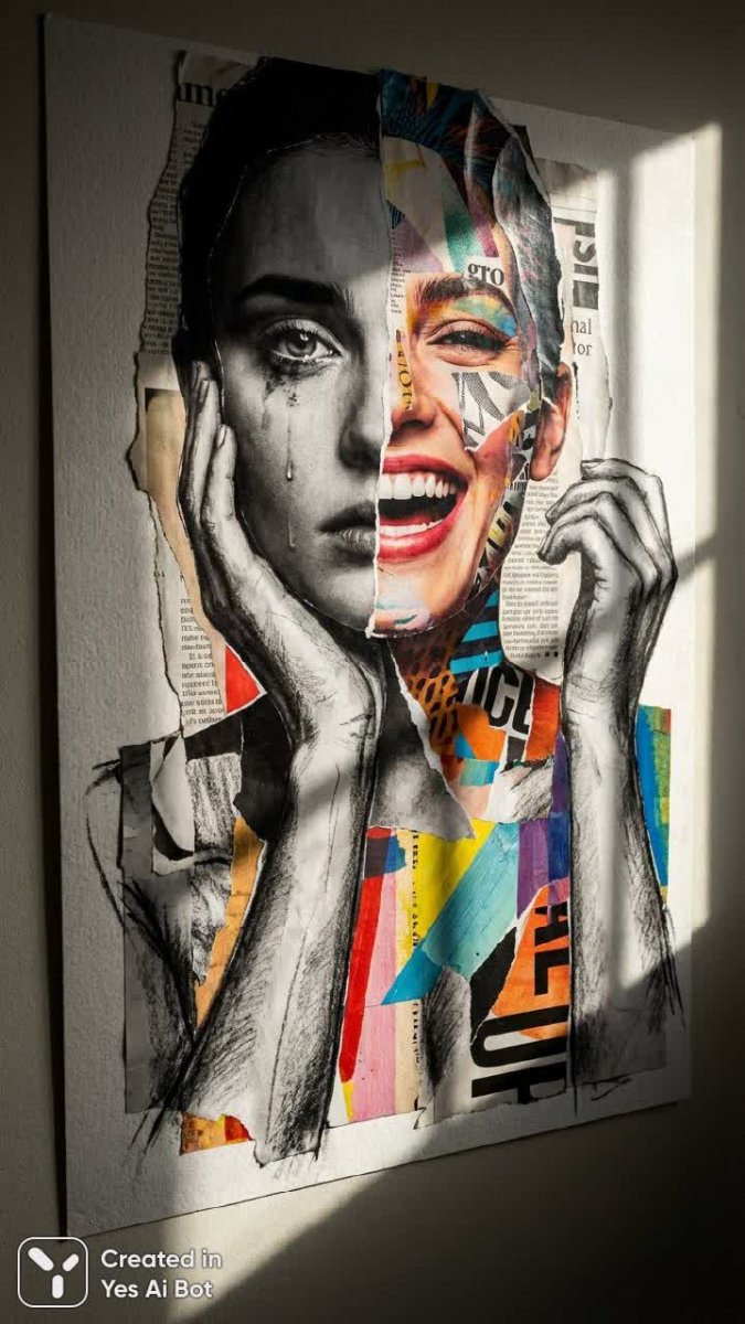 surreal collage, torn paper effect on female figure, overlapping images of contrasting emotions, bw and color blend, dramatic lighting, artistic composition, avant-garde, high detail.