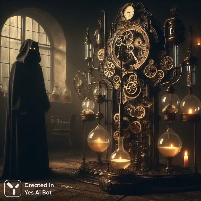 A gloomy room, in the foreground a man in a long black cloak with a hood, under which the outlines of the face and the eyes glowing with a weak yellow light are vaguely visible, stands near a fantastic steampunk machine, a lot of gears, clock dials, pendulums, hourglasses, transparent tubes with circulating in them glowing with a warm white light liquid, glass tanks, a tap with a valve. The man in the cloak holds in his hands a small vial filled with a glowing substance. A richly dressed old man approaches him, holding out gold coins in his palm.