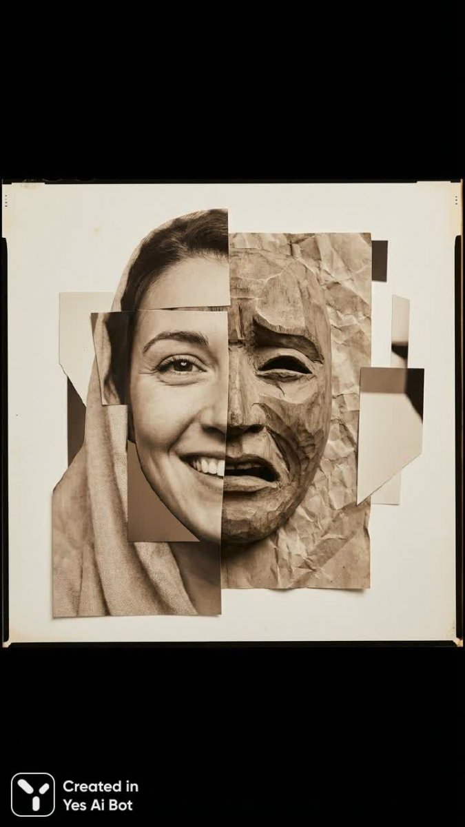 surreal merge, female face half-covered by a torn mask, contrasting textures, minimalist bg, artistic photomontage, emotions of joy and despair, avant-garde style.
