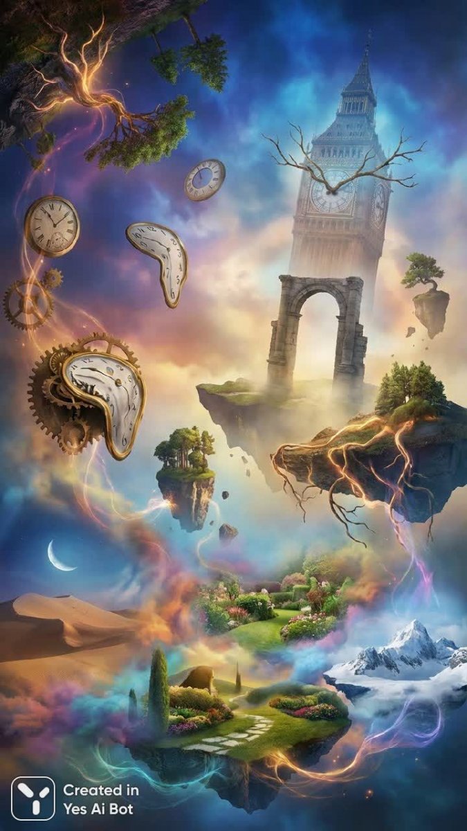 Изображение представляет собой погружение в фантастический мир сновидений, созданный при помощи нейросети Nano-Banana. Оно построено на сочетании фрагментированных пейзажей, напоминающих обрывки воспоминаний и грез, где привычные законы физики не действуют: часы и деревья парят в воздухе, словно невесомые объекты. Цветовая палитра отличается насыщенностью и гармонией, создавая ощущение яркого вихря эмоций и ощущений.
