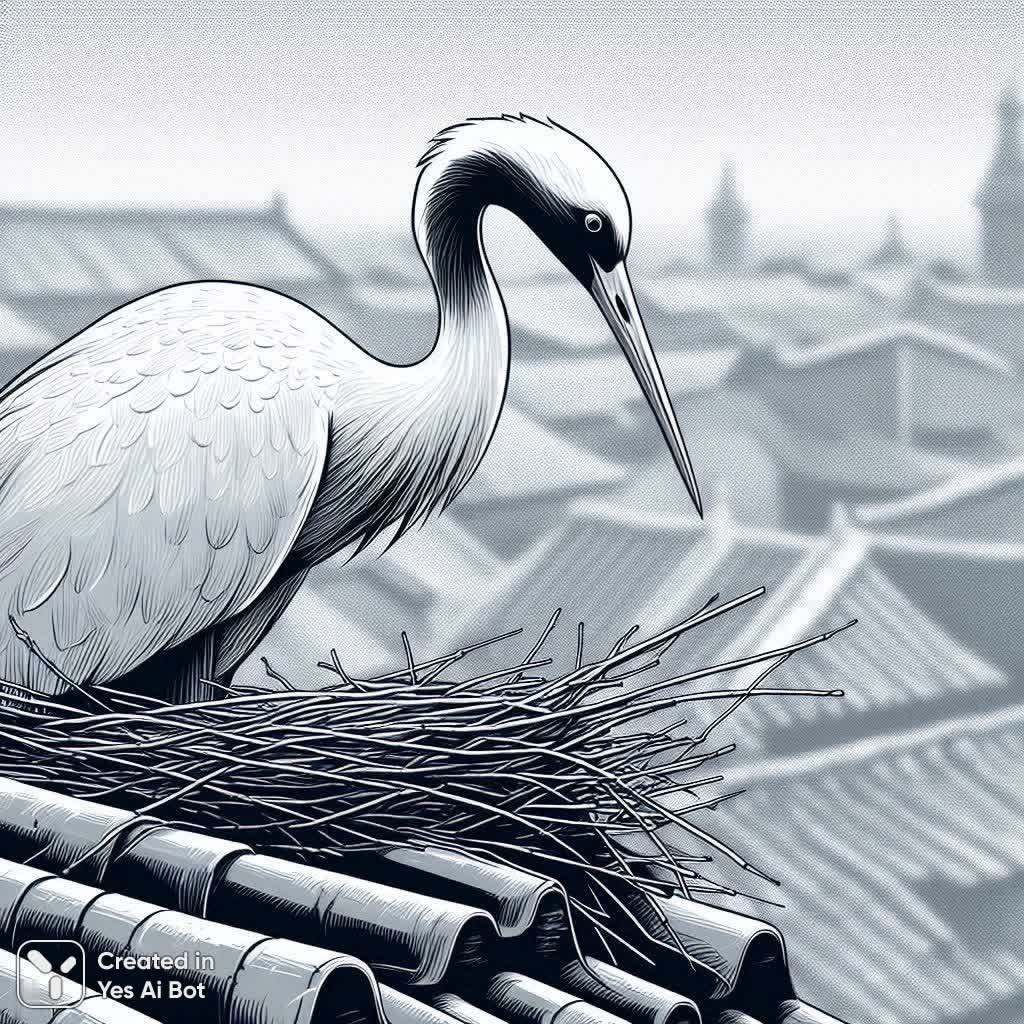 Завораживающая картина природы сочетается с архитектурной красотой старинного города. В центре внимания – величественный журавль, выделяющийся своей изящностью и стройностью силуэта. Крупный план позволяет рассмотреть каждую деталь его оперения, подчеркивая грацию птицы. Расположенное на черепичной крыше гнездо создает ощущение уюта и безопасности, демонстрируя естественную заботу о потомстве. Размытый фон в серо-голубых тонах добавляет изображению глубины и мягкости, создавая контраст с четкостью и графичностью фигуры журавля. Очертания крыш старого города, едва различимые на заднем плане, придают сцене атмосферу истории и спокойствия. Это произведение искусства воплощает гармонию между дикой природой и человеческим окружением, приглашая зрителя задуматься о красоте окружающего мира и хрупкости его равновесия. Фотография передает ощущение умиротворения и созерцания, позволяя насладиться моментом единения с природой в самом сердце старинного города, где каждый элемент композиции работает на создание неповторимого визуального впечатления. Изображение излучает спокойствие и мудрость, словно шепча о вечных циклах жизни и природы