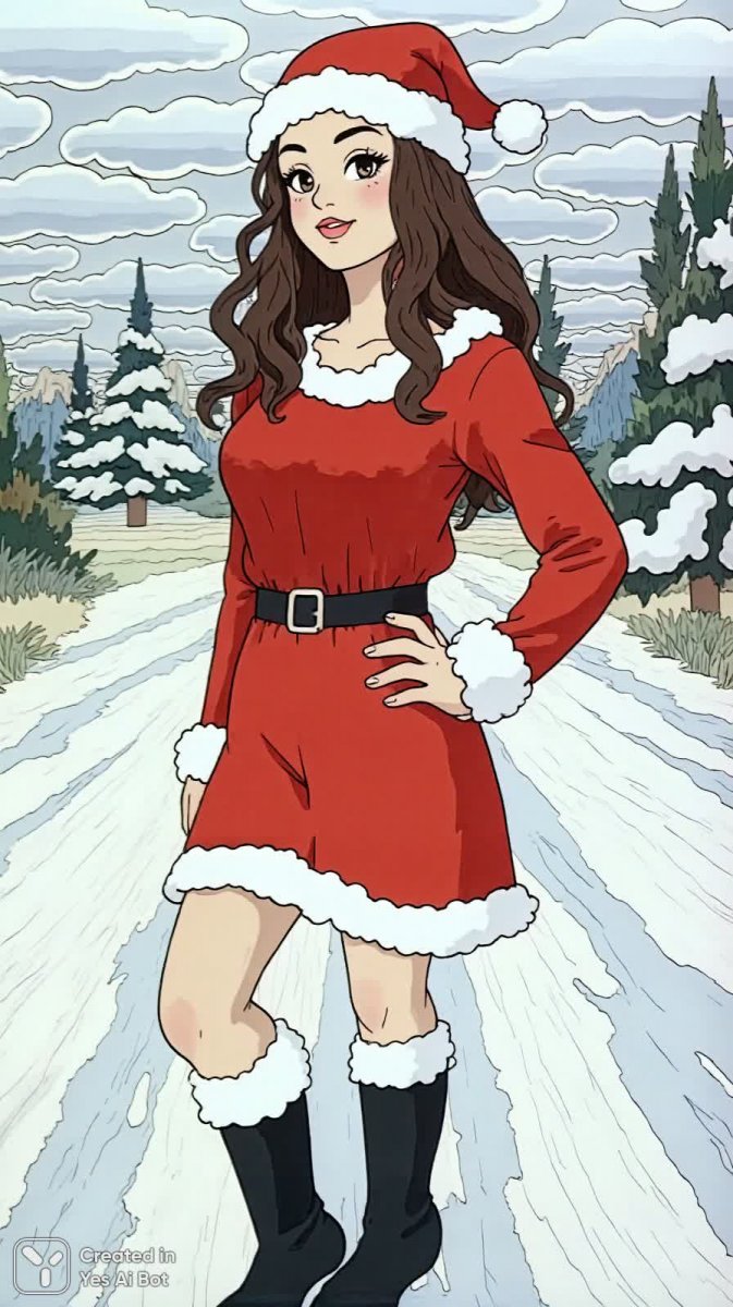 <lora:1378790:1>, professional photo, captured with a canon eos r5 and 85mm lens, standing against snowy background, wearing red and white santa outfit with fluffy trim, long curly brown hair styled down, black ankle boots, confident expression.