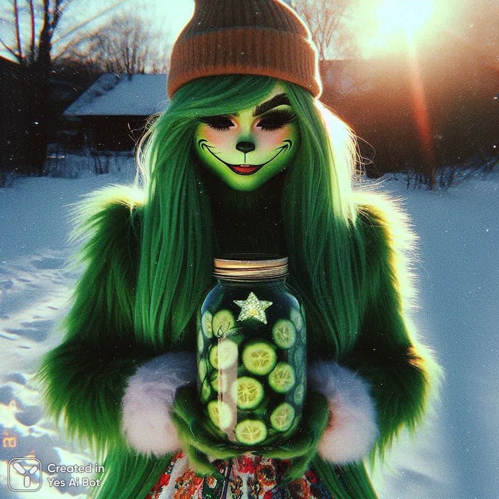 Фото на плёнку, вид через плёнку, игра теней, солнечные блики в золотой час, серо зеленый фон, глитч эффект, full-length улыбается очень Красивая Роскошная пушистая Гринч монстрик 👑 длинные зеленые прямые волосы, шапка бини, слегка готично, в белых высоких сапогах платформы в красочном коротком ярком подробно вышитом узор платье держит в руках гигантские банки с огурцами и сверкающая звёзда внутри, зимней ночью, в снегу, старая ретро пленка, ломография, свечение