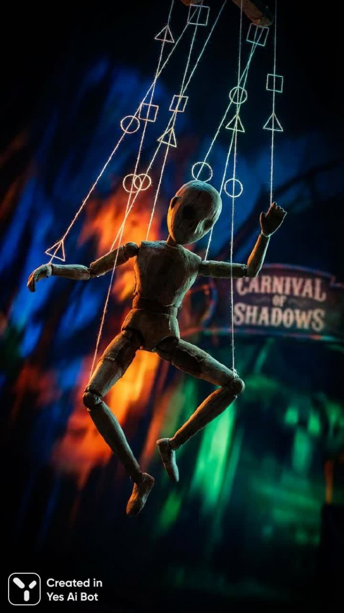 nanobanana Танцующая марионетка в карнавале теней: минимализм и яркие краски движения. Картинка из нейросети Nano-Banana