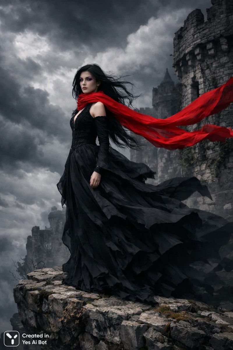На скалистом утесе, освещаемом лишь тусклым светом загустевших облаков, стоит загадочная девушка с аметистовыми глазами, ее длинные черные платья развеваются на ветру. Она смотрит вдаль, словно ожидая кого-то или чего-то, а ярко-красный шарф обвивает ее, создавая живописный контраст с серыми тонами неба. Вокруг ее силуэта скапливаются мрачные облака, как будто природа сама собрала свои тени, чтобы укрыть ее. Древние каменные стены замка, обвивающиеся дикими растениями, усиливают атмосферу заброшенности и ожидания. Палитра: серый, черный, бордовый, ярко-красный и белый, магия света и тени. В готическом стиле.