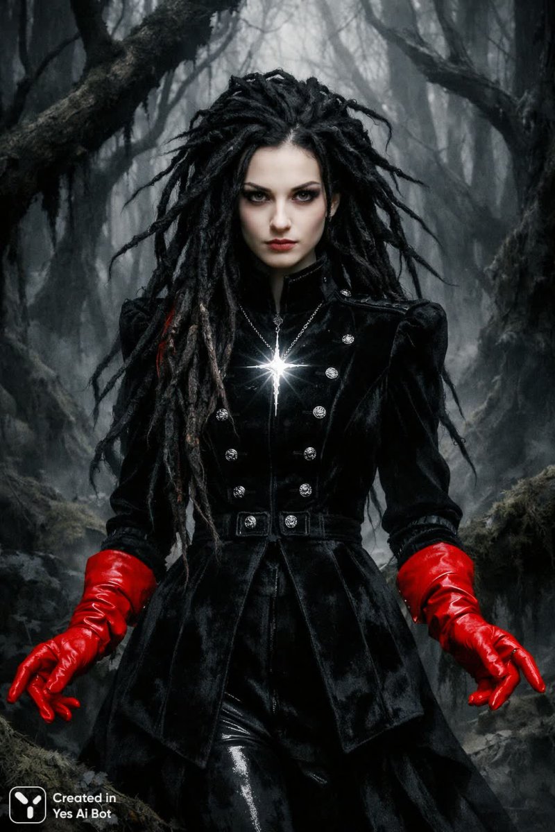 В глухом лесу под завесой тумана стоит девушка с мундиром из черного бархата, ее дреды словно отражают темные ветви деревьев. Серебристый камень на её шее сверкает, как звезда в ночи, а ярко-красные перчатки контрастируют с её бледной кожей. Её выражение лица исполнено решимости, как будто она готова призвать силы природы, покоящиеся вокруг. Окружение из искривленных деревьев и мха, намекает на прошлые тайны. Палитра: черный, серый, бордовый, ярко-красный и белый, игра светотени. В готическом стиле.