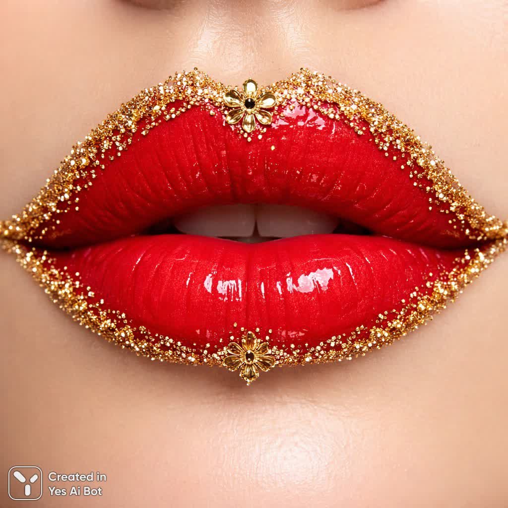 hyper realistic, photorealistic, a close-up woman's lips, bright red color, gold glitter in a symmetrical pattern around edges, small gold flower design adding elegance.