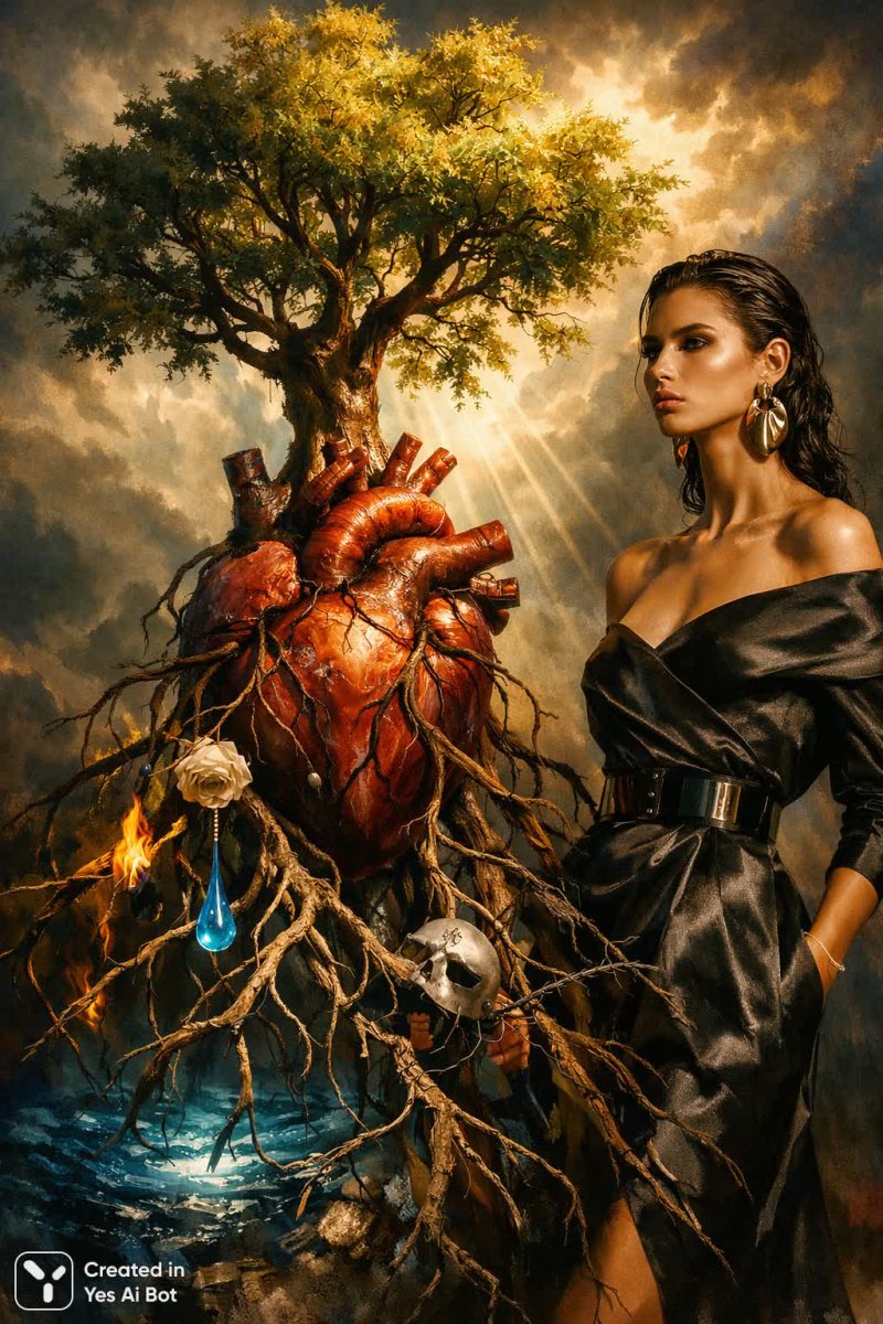 4. surreal combination, a tree growing from a human heart, roots intertwined with emotions, painterly style, vivid contrasts of light, symbolizing growth and pain, atmospheric depth creating an otherworldly scene.