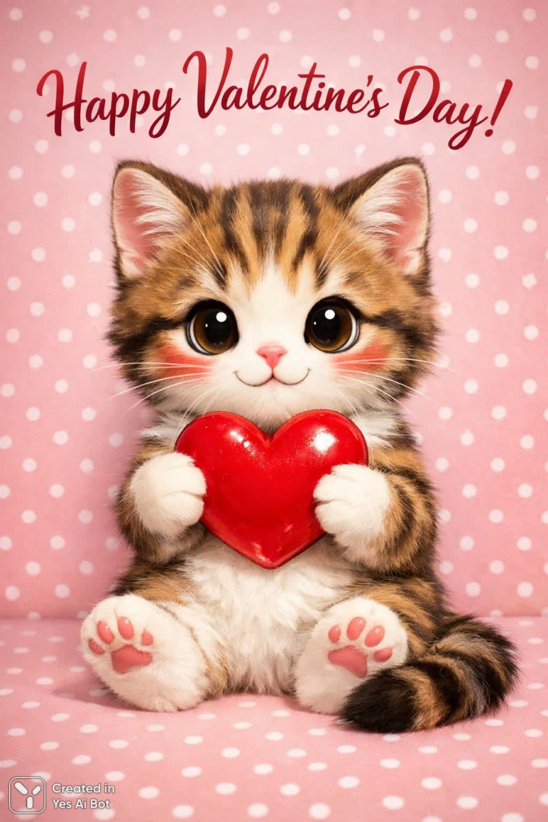 cute drawn cat, red heart in paws, "happy valentine's day!" text above, pink dotted background, cheerful style, adorable features, angle: straight on, camera: olympus om-d e-m1, lens: 25mm f/1.8.