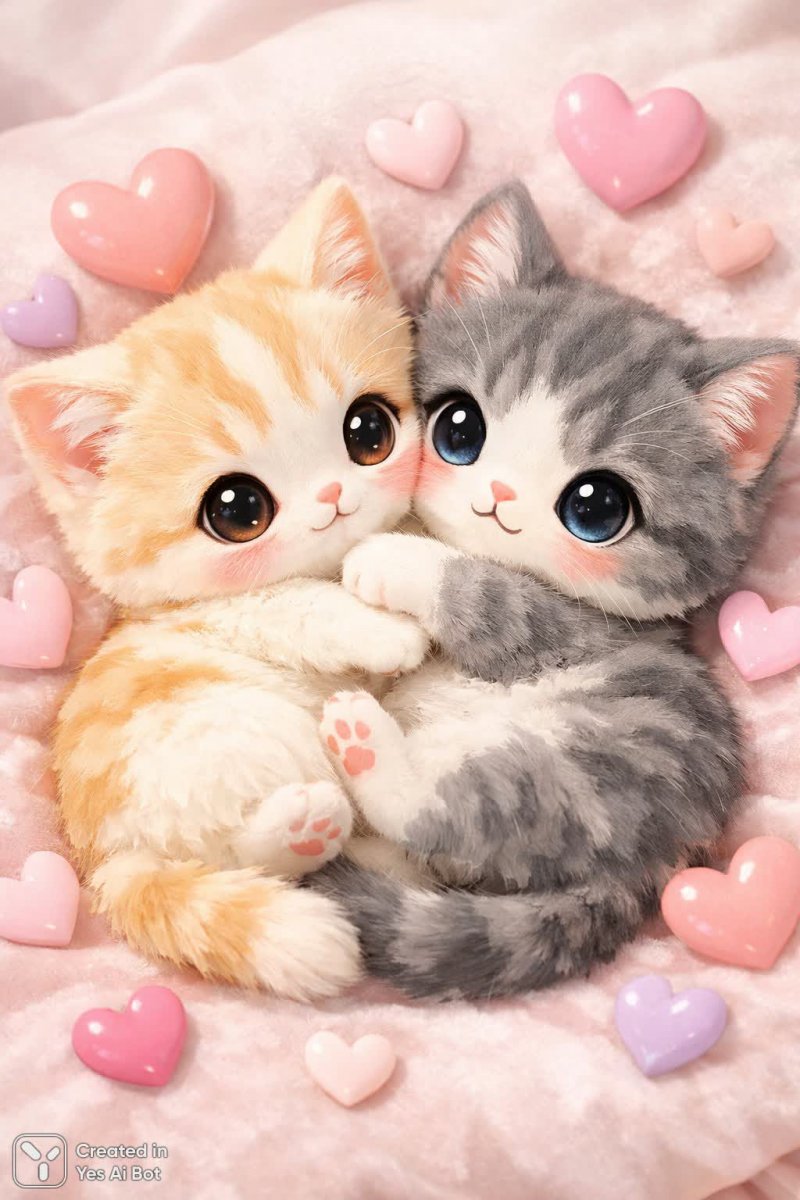 cute drawn kittens, cuddling together, big eyes, surrounded by hearts, pastel colors, kawaii style, simple illustration, elevated view, DSLR camera, 50mm lens.