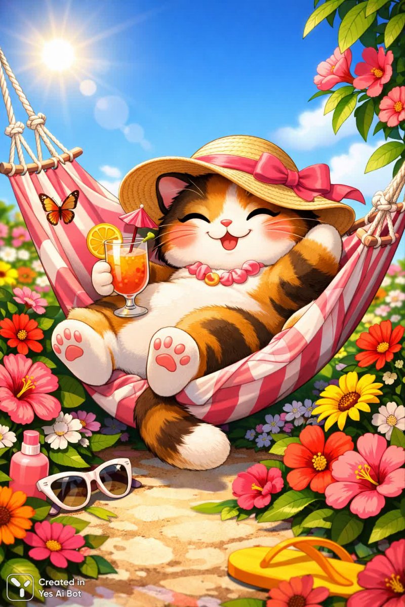 chubby cartoon cat, lounging in a hammock, wearing a sun hat, playful smile, surrounded by flowers, vibrant colors, vector style, high quality, 35mm lens, wide-angle view.