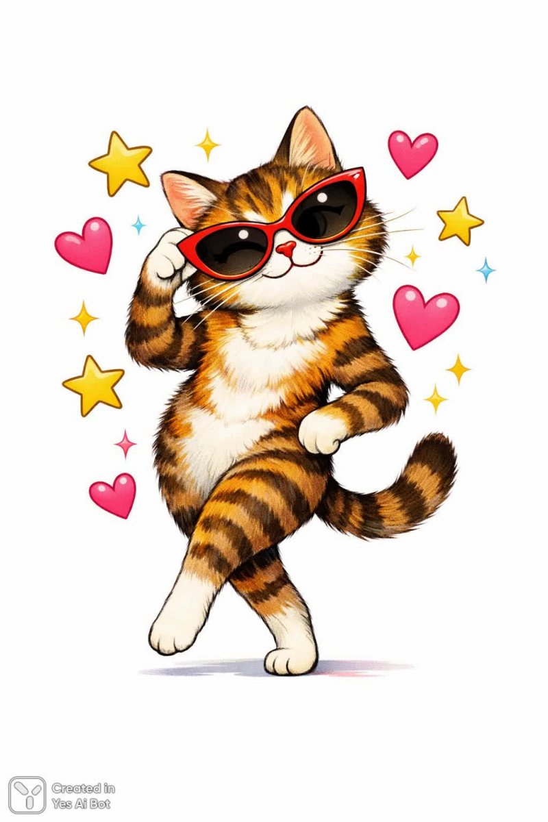 Забавный набросок кота в очках, окруженного парящими звездами и сердечками, демонстрирует причудливую позу. Яркие цвета создают жизнерадостное настроение, а минималистичный стиль цифровой иллюстрации подчеркивает легкость и игривость образа. Качественное изображение, выполненное с использованием объектива 35 мм и снятое на уровне глаз, позволяет зрителю полностью погрузиться в атмосферу сказочного мира, где обитает этот очаровательный персонаж. Идеально подходит для оформления детских товаров, дизайна открыток или использования в качестве забавного аватара. Иллюстрация передает ощущение тепла, уюта и беззаботности, располагая к улыбке и создавая позитивный настрой. Стиль исполнения сочетает в себе простоту линий и насыщенность цветовой палитры, что делает изображение визуально привлекательным и запоминающимся. Этот цифровой шедевр обязательно привлечет внимание своей оригинальностью и милотой, став прекрасным украшением любого проекта. Высокое качество исполнения гарантирует отличную детализацию и четкость изображения при любом масштабе использования