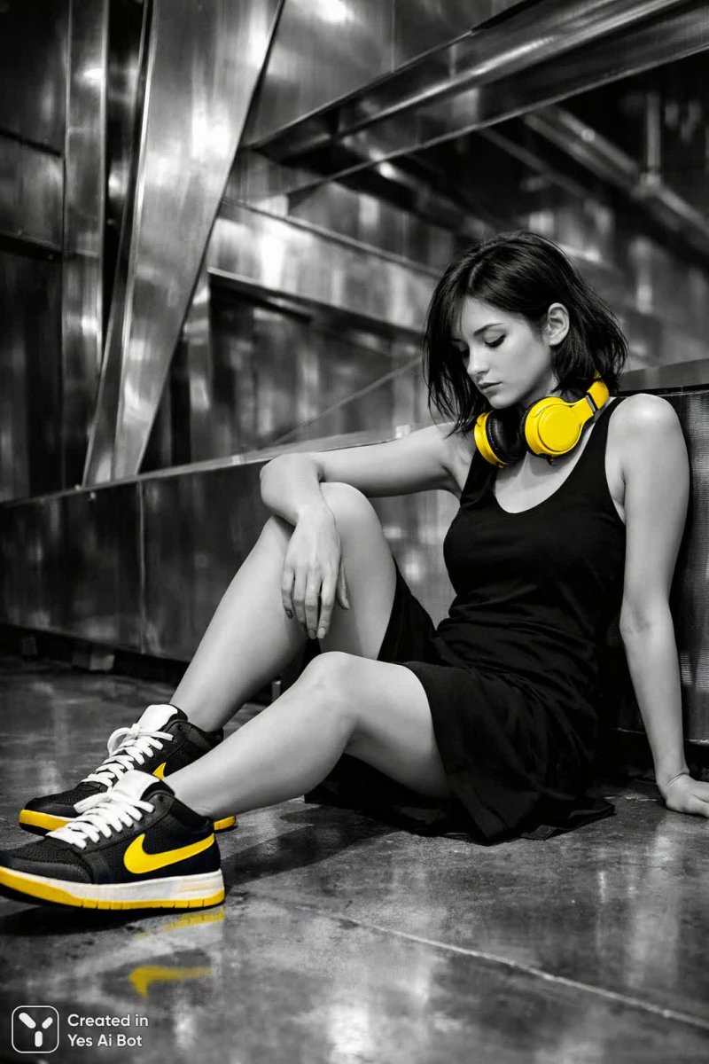 monochrome, bw digital art, bright yellow accent on sneakers, minimalistic, young woman lounging in an industrial space, dressed in a simple black dress, with bright yellow headphones around her neck, looking thoughtfully at the floor, BG features abstract metallic structures.