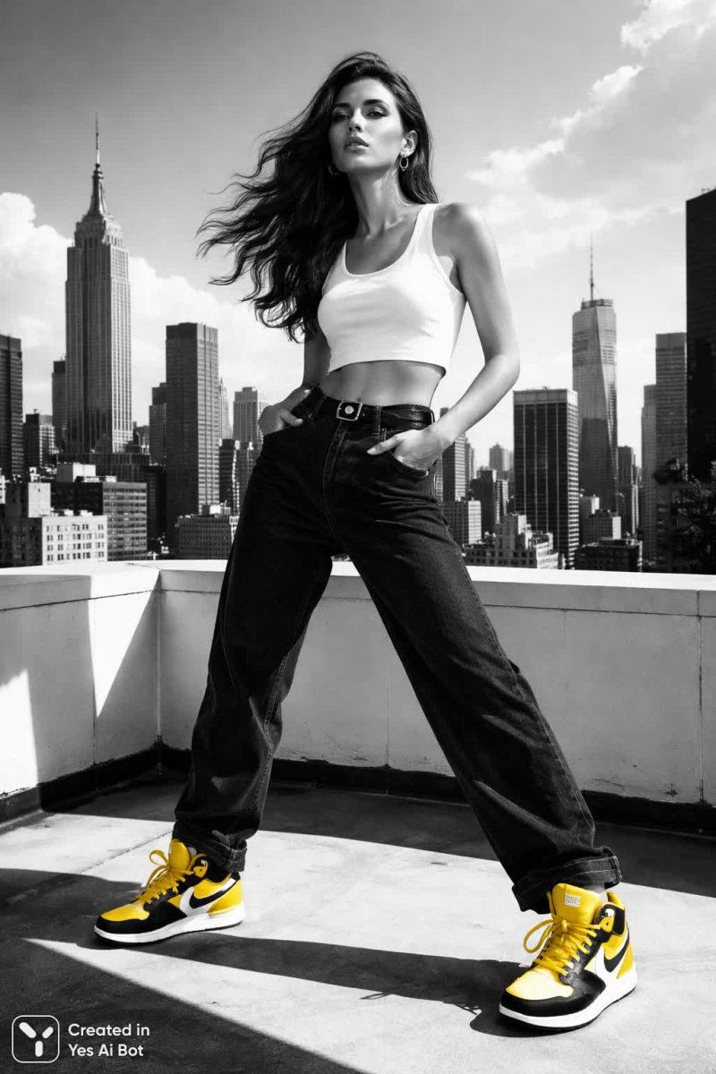 Монохромное цифровое искусство с ярким акцентом желтого цвета на кроссовках – это визуальная ода минимализму и уверенности. Молодая женщина эффектно позирует на крыше, создавая захватывающий контраст между черно-белой полосатой кофточкой и темными джинсами. Ее взгляд направлен в городскую панораму с непоколебимой решимостью, а поза излучает силу и стиль. Фон представляет собой резкое сочетание теней и света, подчеркивающее графичность композиции и добавляющее глубины изображению. Эта работа демонстрирует мастерское использование светотени для создания драматического эффекта, фокусируясь на деталях одежды и выражении лица модели. Желтый акцент на обуви служит смелым заявлением, нарушая монохромную палитру и притягивая взгляд зрителя к кроссовкам. Вся сцена пронизана атмосферой современной моды и городского шика, передающей ощущение свободы и независимости. Изображение выполнено в лаконичном стиле, что позволяет зрителю полностью погрузиться в атмосферу уверенности и современного искусства, ощущая пульс большого города под ногами. Это визуальный гимн индивидуальности, сочетающий в себе минимализм, яркий акцент и неповторимый стиль