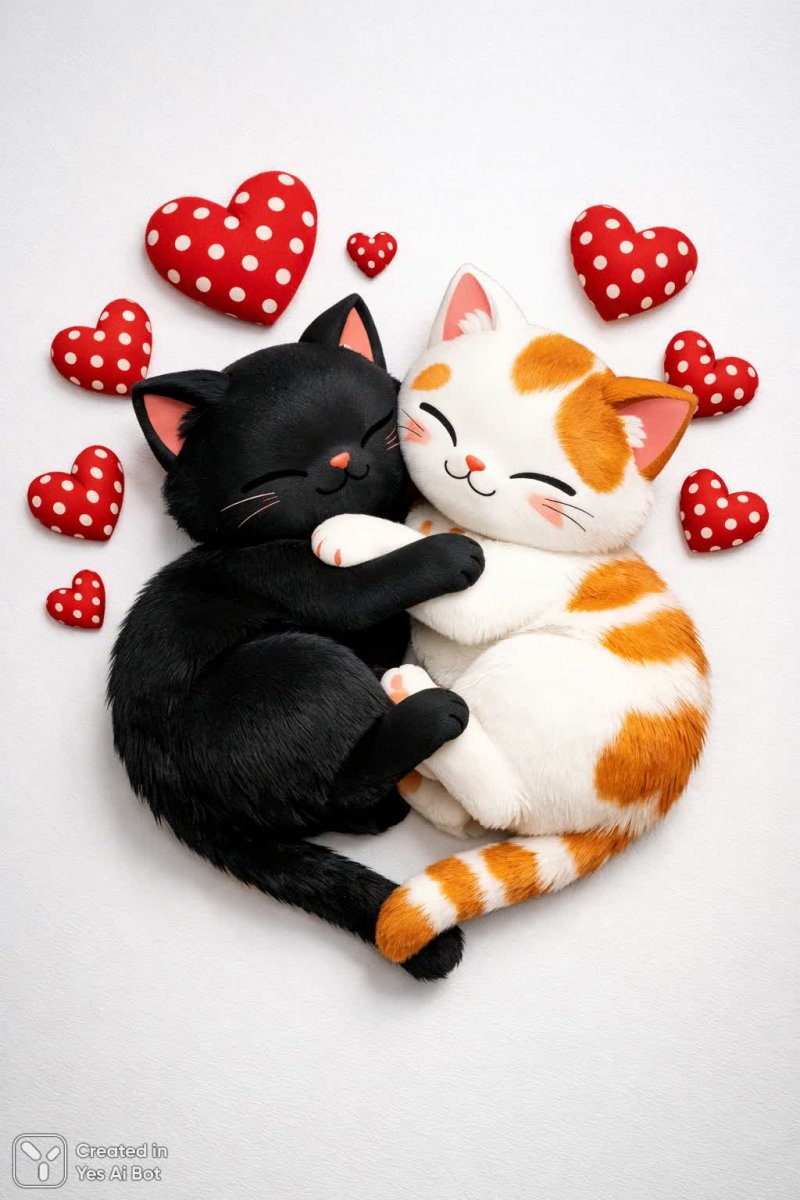 Милые котята в сердечках: иллюстрация для детей и уютная поза - Картинка, сгенерированная нейросетью Sora