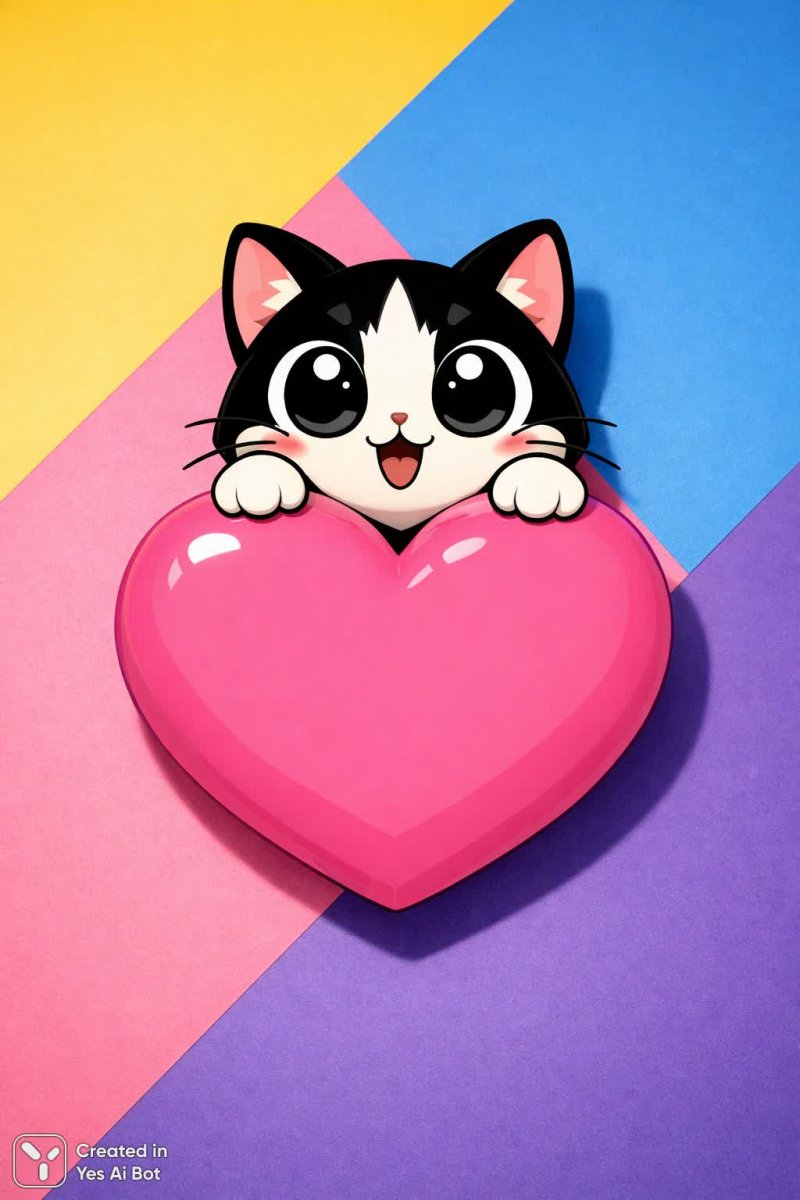 cartoon cat, funny expression, peeking from behind pink heart, colorful BG, large eyes, minimalism, vector art, top-down angle, DSLR camera, 35mm lens.