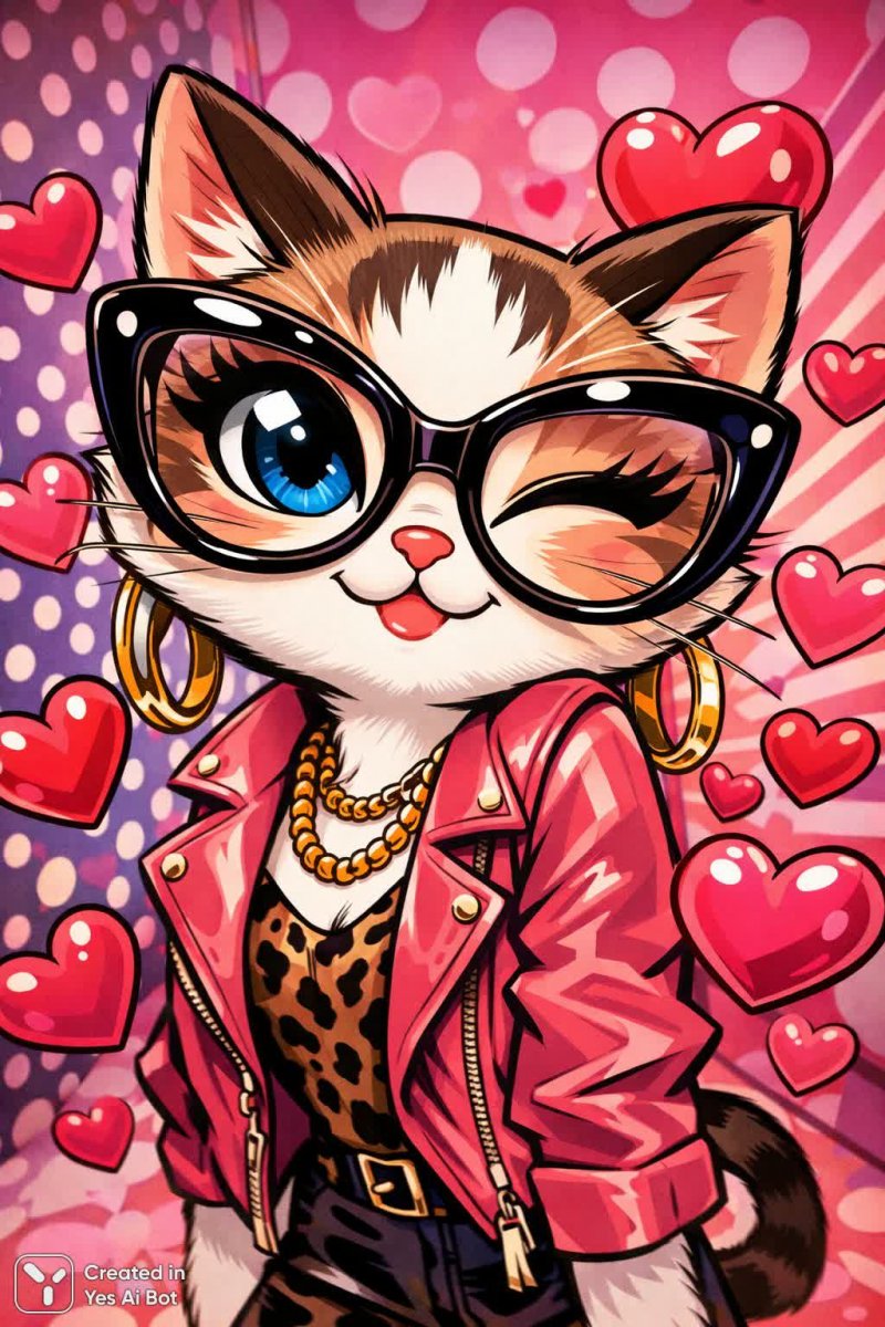 cartoon cat, winking with oversized glasses, surrounded by floating hearts, vibrant colors, charming outline, background with simple patterns, frontal view, smartphone camera, wide-angle lens.