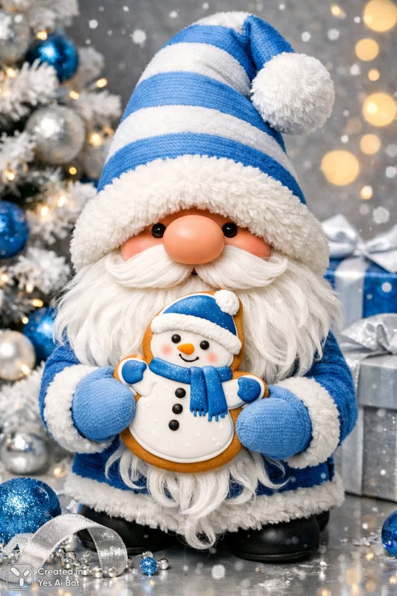 christmas gnome, wearing blue and white striped hat, big white beard, holding a snowman cookie, festive atmosphere, cartoon style, bright colors, BG, cheerful design