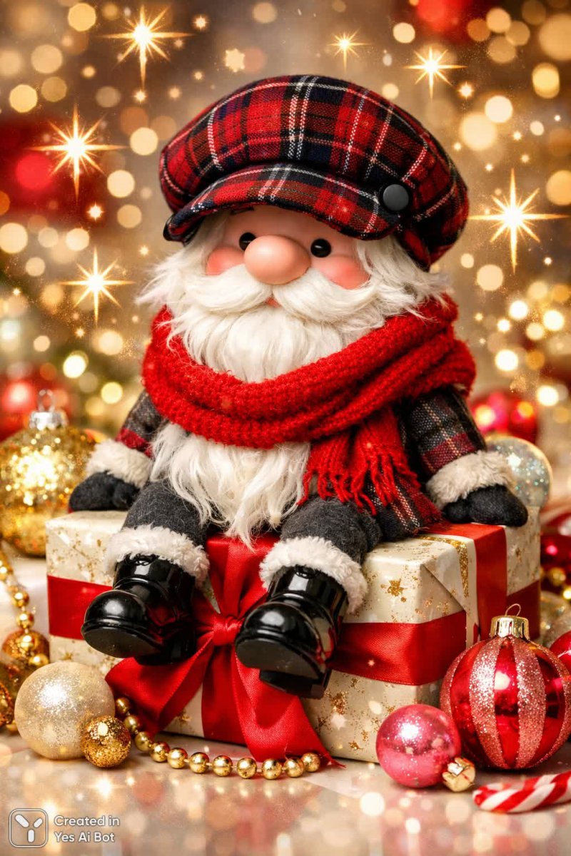 gnome with red scarf and plaid hat, sitting on a gift box, surrounded by sparkling stars and ornaments, cute illustration, cozy holiday vibe, BG, playful colors