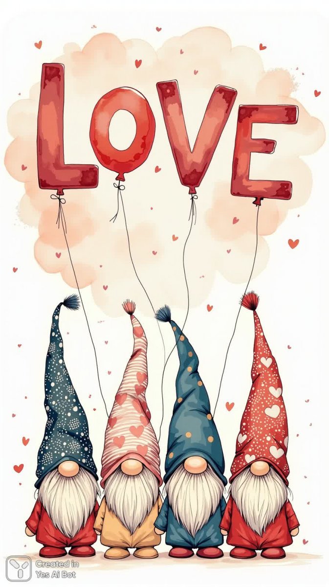 3. four gnomes, wearing patterned hats, spelling "LOVE" with balloons, doodling style, romantic theme, festive colors, BG, cute and joyful illustration