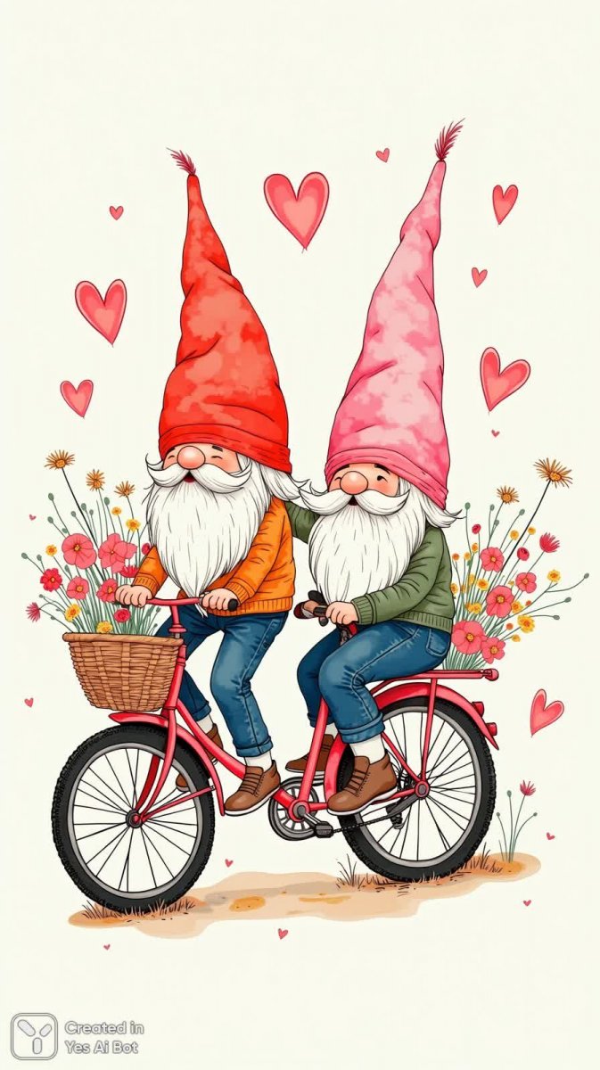 1. two gnomes on bicycle, pink and red hats, flowers in hand, zentangle art style, hearts around, cheerful atmosphere, simple illustration, BG