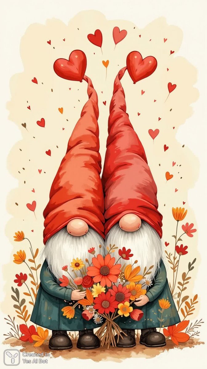 5. two gnomes in matching hearts hats, intertwined, holding bouquet of flowers, cute illustration, cheerful background, warm colors, naive art style