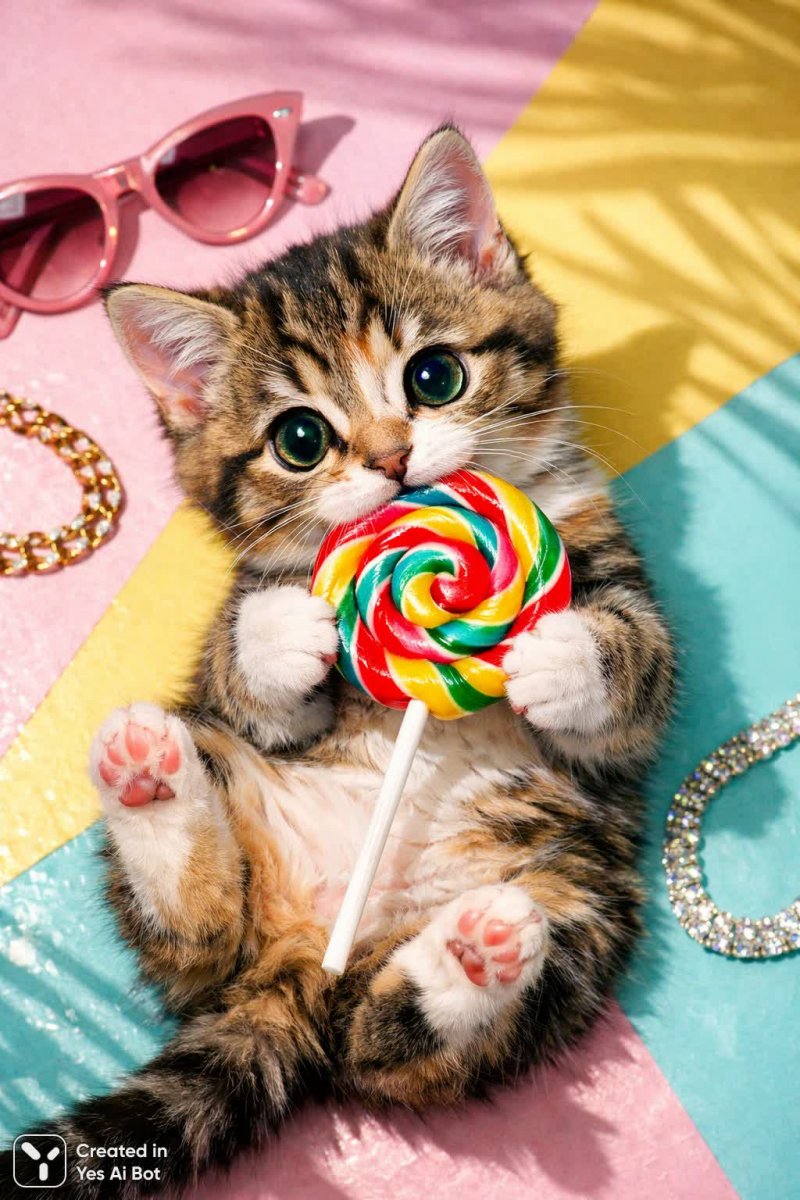 1. cute kitten, holding colorful lollipop, big eyes, bright background, playful pose, top-down angle, high-quality detail, 50mm lens.