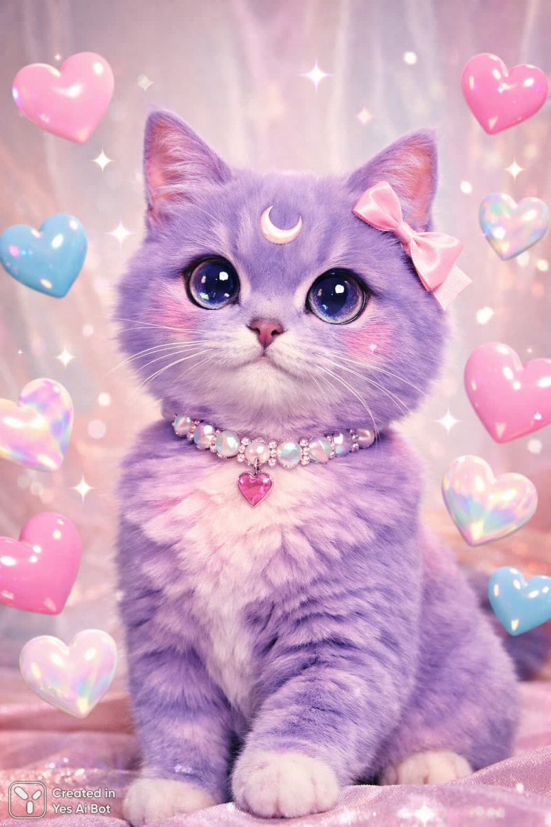 3. adorable purple cat, surrounded by floating hearts, whimsical design, bright pastel color palette, medium shot, mirrorless camera, 24mm lens.