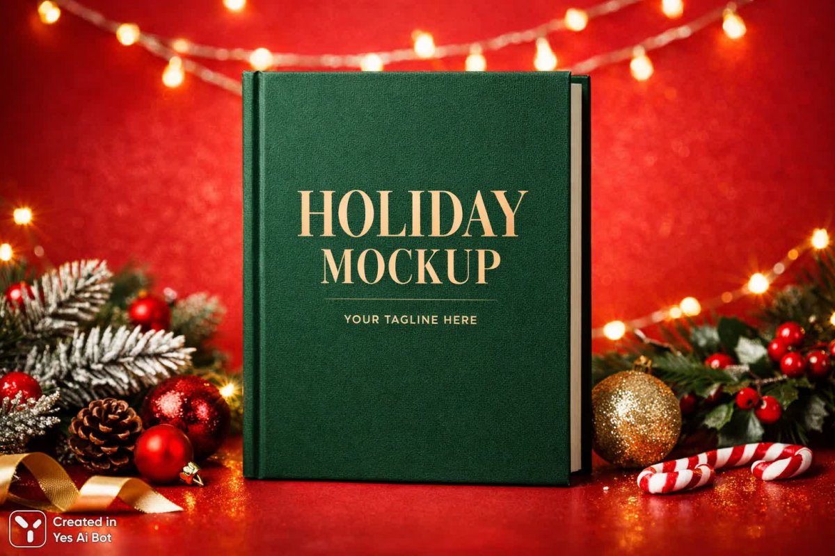 mockup of a green book cover without text set against a bright red background, designed in a festive holiday atmosphere. soft glowing lights and subtle decorations create a warm, cheerful vibe, evoking the spirit of the season. detailed textures and balanced composition make it ideal for promotional use.