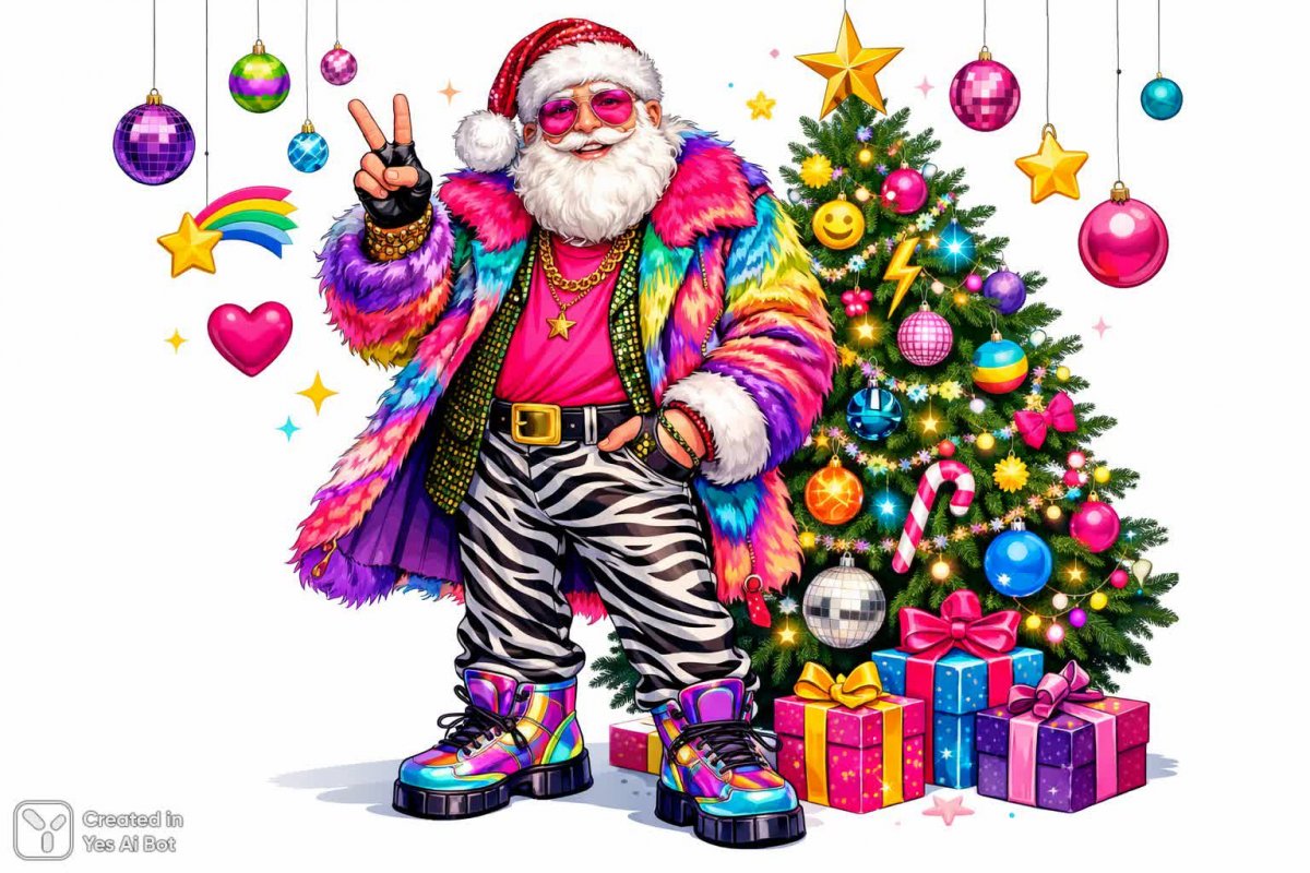 Santa Claus in a funky outfit, peace sign gesture, bright colors, standing next to a decorated Christmas tree, cartoon style, white background with colorful ornaments, joyful atmosphere.