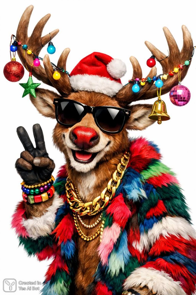 cartoon festive reindeer with sunglasses, colorful decorations, doing a peace sign, humorous style, white background, vibrant atmosphere.
