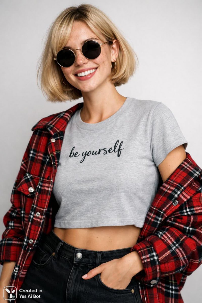 professional photo, nikon d850, 35mm lens, three-quarters shot, stylish girl, bob cut blonde hair, porcelain skin with freckles, wearing light grey cropped t-shirt with “BE YOURSELF” slogan, high-waisted plaid trousers, round sunglasses, smiling cheerfully, focus on clothing details, soft studio lighting, clean backdrop, high detail.