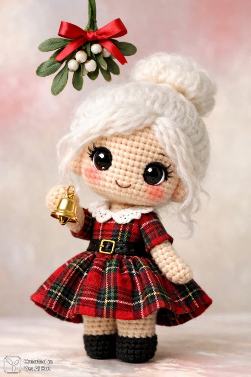 crocheted doll with fluffy white hair styled in a bun, wearing a red and green plaid dress, holding a tiny golden bell, big round eyes sparkling with joy, standing under a mistletoe, BG is soft pastel colors.