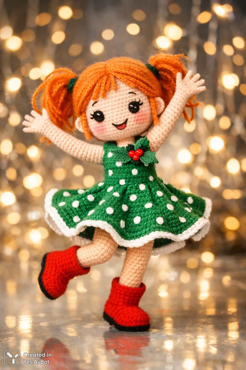 crocheted doll with playful orange hair in pigtails, wearing a vibrant green dress with white polka dots, adorned with a holly brooch, and red boots, twirling joyfully with hands in the air, BG is decorated with twinkling lights.