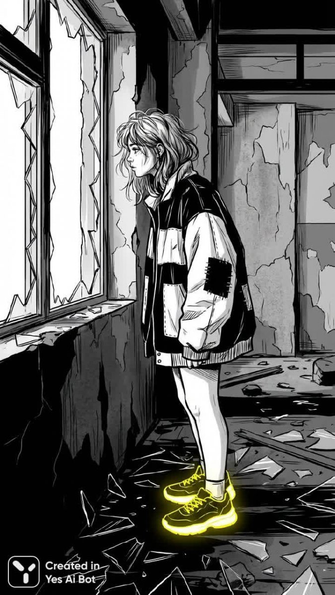 Монохромное цифровое искусство передает атмосферу заброшенности и меланхолии. В центре композиции – молодая женщина, исследующая полуразрушенное здание. Ее образ контрастирует с серым фоном благодаря ярко-желтому акценту на кроссовках, который притягивает взгляд и добавляет динамики в минималистичную сцену. Детали одежды подчеркивают ощущение разрухи: разорванная куртка в черно-белой гамме, небрежно уложенные волосы. Взгляд девушки направлен на разбитое окно, наполненный любопытством и легкой тревогой. На заднем плане – осколки стекла и осыпающаяся штукатурка, создающие ощущение времени, остановившегося в этом забытом месте. Художественный прием монохромности усиливает драматизм и погружает зрителя в мир одиночества и размышлений о прошлом, а яркий желтый цвет становится символом надежды или неожиданного открытия на фоне упадка и разрушения. Картина вызывает чувство созерцания и заставляет задуматься о хрупкости жизни и неизбежности перемен. Использование минимализма позволяет сосредоточиться на эмоциональном состоянии героини и передать атмосферу загадочности и таинственности, царящую в заброшенном здании. Это визуальное повествование об исследовании, любопытстве и столкновении с прошлым, воплощенное в лаконичной и выразительной форме цифрового искусства