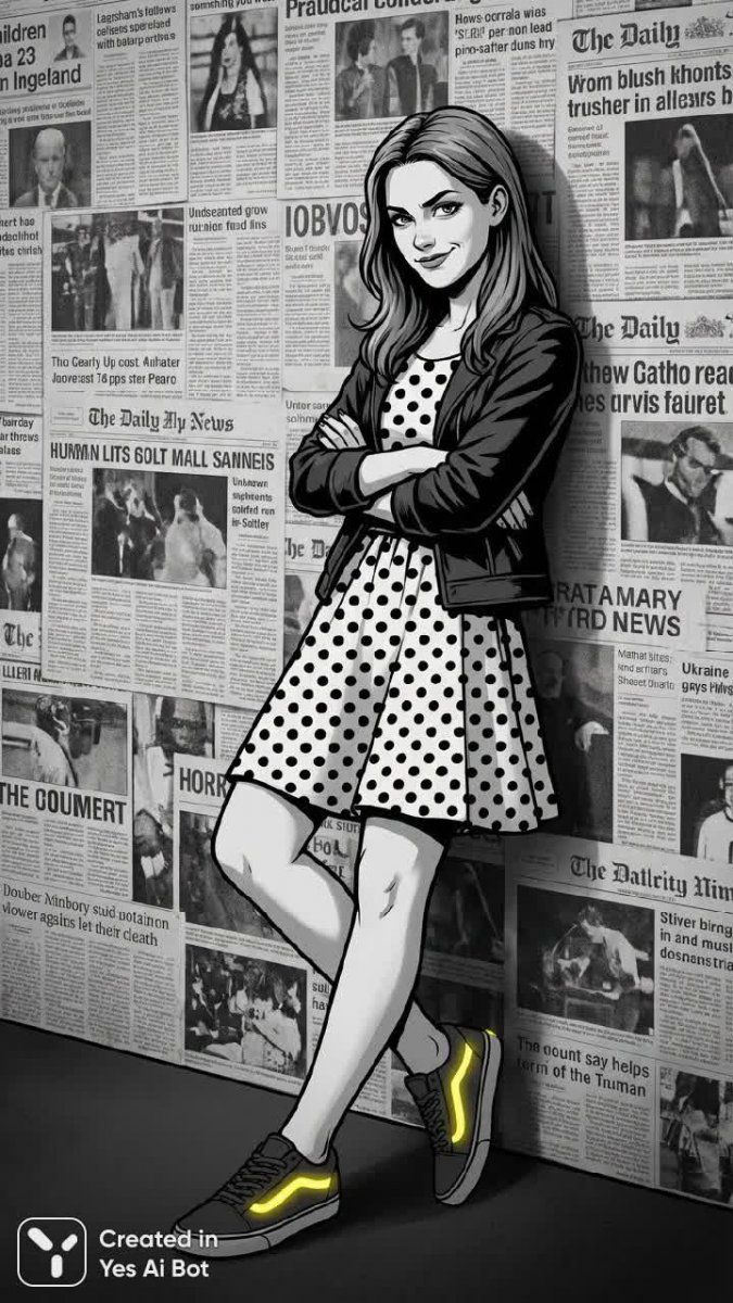 monochrome, bw digital art, bright yellow accent on sneakers, minimalistic, young woman against a wall of newspaper clippings, wearing a bw polka dot dress, arms crossed with a smirk, BG filled with faded headlines and black-and-white images.