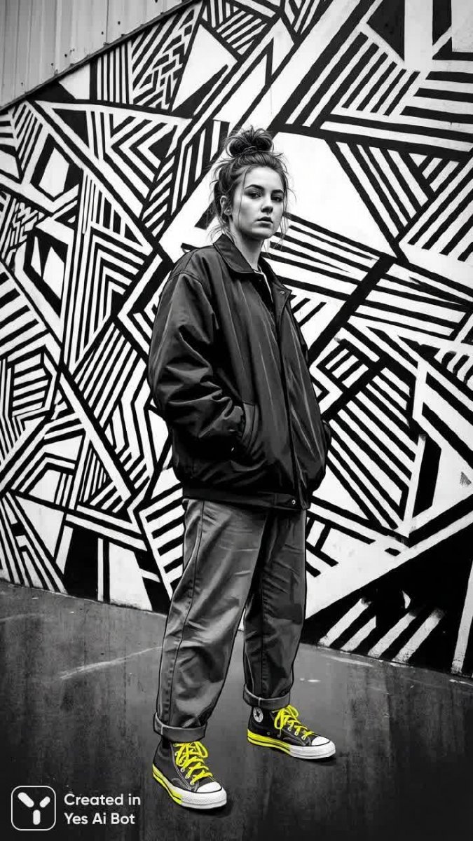 Современная городская элегантность в черно-белой гамме с ярким акцентом. На фоне абстрактной монохромной фрески, словно ожившей из мира графики и цифрового искусства, позирует молодая женщина. Её образ – воплощение минимализма и расслабленной уверенности: объемный черно-белый свитер создает ощущение уюта и свободы, а небрежный пучок подчеркивает естественность. Руки, удобно спрятанные в карманах, добавляют образу непринужденности и загадочности. Акцент яркого жёлтого цвета на кроссовках динамично выбивается из общей черно-белой палитры, словно вспышка энергии и индивидуальности. Геометрические узоры на заднем плане создают эффект глубины и визуальной гармонии, добавляя композиции графичности и современности. Вся сцена пронизана атмосферой спокойствия и уверенности, отражая эстетику современного городского стиля и подчеркивая красоту простоты и контраста. Это не просто фотография – это стильное высказывание, запечатлевшее момент гармонии между человеком и пространством, где искусство становится частью повседневной жизни
