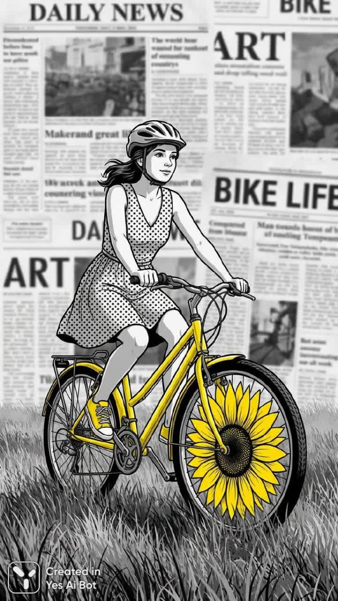 Летняя прогулка в черно-белом мире с ярким акцентом. Молодая женщина на велосипеде насыщенного желтого цвета мчится по зеленому лугу, выделяясь на фоне монохромной палитры. Ее платье в горошек гармонично дополняется огромным подсолнухом, украшающим переднее колесо велосипеда, создавая игривый и запоминающийся образ. Фон картины представляет собой стилизованное сочетание черно-белой фотографии и разбросанных обрывков газетных статей, добавляя композиции глубины и намека на историю, запечатленную в моменте. Яркий желтый цвет велосипеда и подсолнуха выступает как смелый акцент, словно луч солнца, пробивающийся сквозь серую пелену, наполняя сцену оптимизмом и энергией. Минималистичный стиль изображения подчеркивает красоту простых форм и линий, создавая ощущение легкости и свободы. Эта работа – ода летнему настроению, молодости и радости движения в гармонии с окружающим миром, где даже небольшие детали могут стать ярким центром внимания