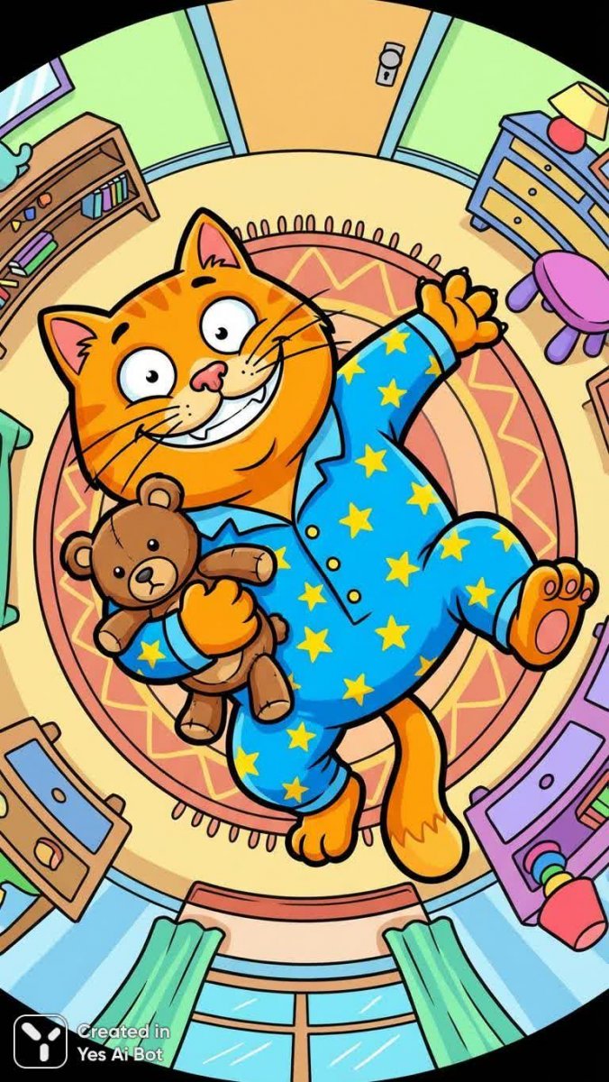 cartoon cat, pajamas with yellow stars, holding teddy bear, clipart style, bright colors, humorous expression, big smile, high angle, fisheye lens.