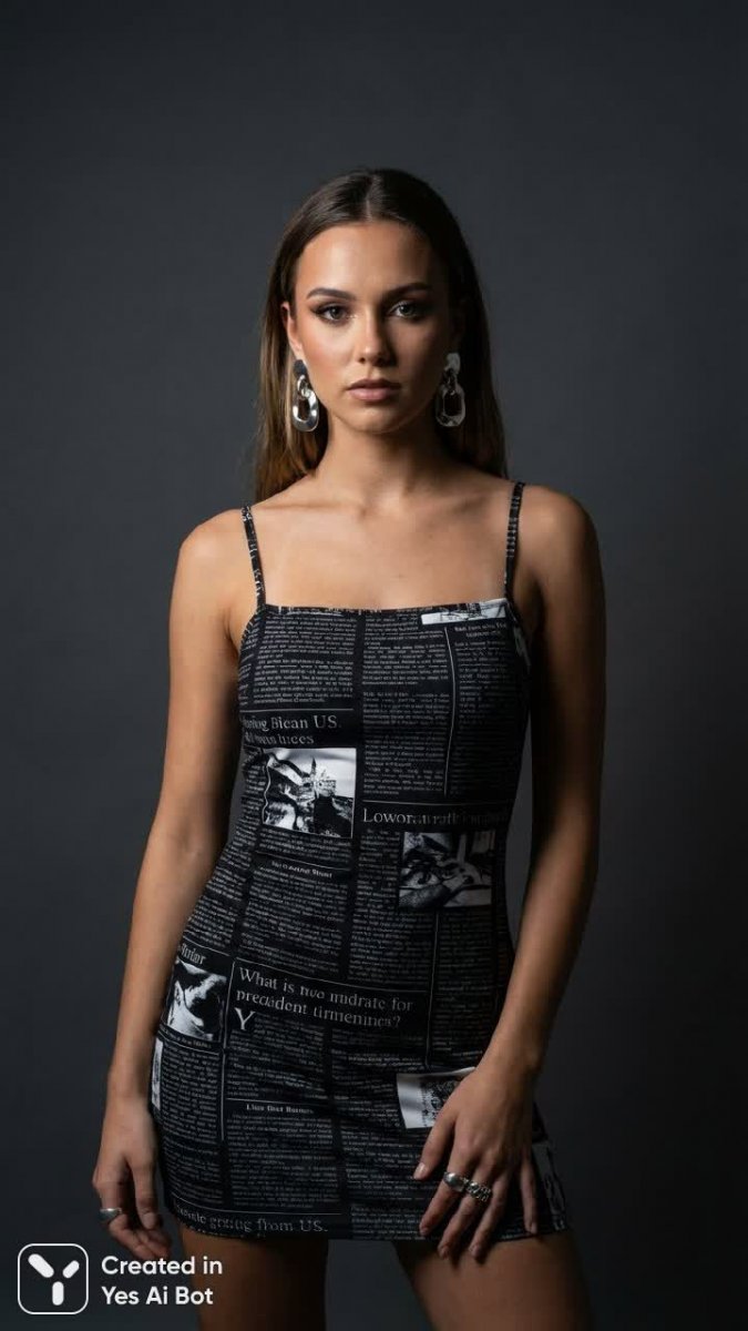 Изысканный портрет молодой женщины, выполненный в стиле современной модной фотографии. На фоне нейтрального серого цвета она предстает в элегантном черном платье с оригинальным принтом, напоминающим типографский развод газетной верстки. Прямой взгляд, полный уверенности и загадочности, приковывает внимание зрителя. Вечерний образ подчеркивается изящными современными украшениями, гармонично дополняющими лаконичность наряда. Высокий контраст усиливает визуальное воздействие, создавая эффектную игру света и тени. Фотография выполнена в высоком разрешении с максимальной детализацией, обеспечивая фотореалистичный результат. Использование объектива 50 мм позволяет добиться естественной перспективы и подчеркнуть красоту лица модели. Кадр снят по пояс, на уровне глаз, что создает ощущение непосредственного контакта со зрителем. Это портрет, сочетающий в себе классическую элегантность и современный стиль, демонстрирующий безупречный вкус и внимание к деталям. Композиция выдержана в строгих рамках, акцентируя внимание на выразительности лица и фактуре ткани. Вся картина излучает атмосферу утонченности и уверенности, воплощая идеал современной женской красоты